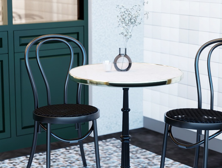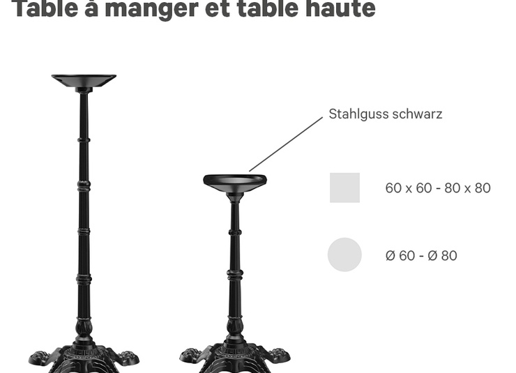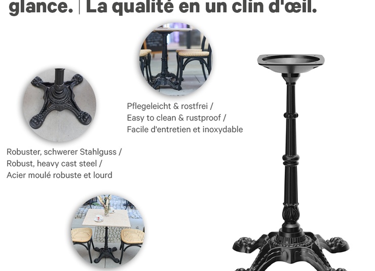 The Venera model stands on four feet as a dining table or a high table which fits into a popular French bistro look. The frame is made of black cast steel. It is compatible with round tabletops with a diameter of 60 to 80 cm and with square tabletops from 50 x 50 cm to 80 x 80 cm.Product Code