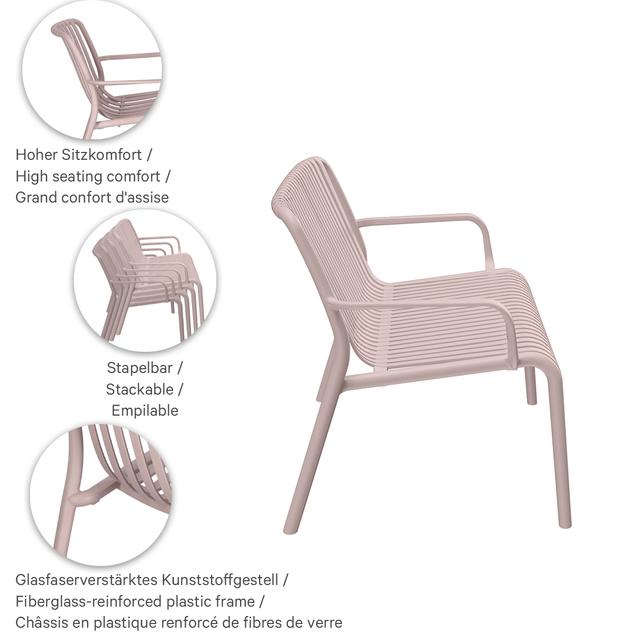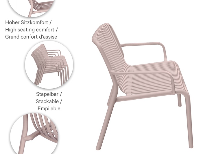 Elexia – Versatility meets modern design. Available as a chair, armchair, lounge chair, and 2-seater: the fiberglass-reinforced polypropylene series is durable, lightweight, and perfect for system catering. The elegant slatted design not only adds style but also gently adapts to the body for optimal comfort. Available in two colors, and fully stackable, Elexia combines functionality with timeless aesthetics. Ideal for both indoor and outdoor use.